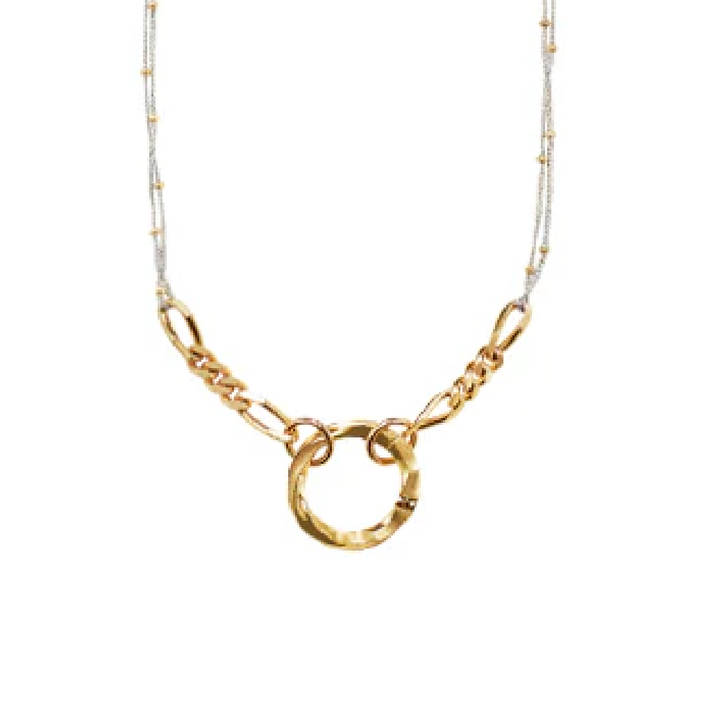 KINTSUGIのエッセンスをデュオチェーンに融合させた、スペシャルピース。トップには、ご縁を意味する「EN」のサークル、サイドにはインフィニティ「∞」を意味するKINTSUGIのサークルを配し、永遠に続くご縁という意味合いも込めました。無造作に一点つけるだけで唯一無二の存在感を醸し出してくれます。