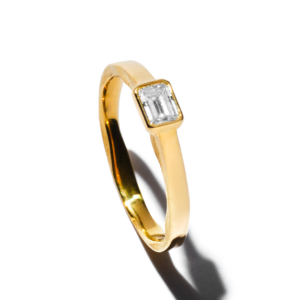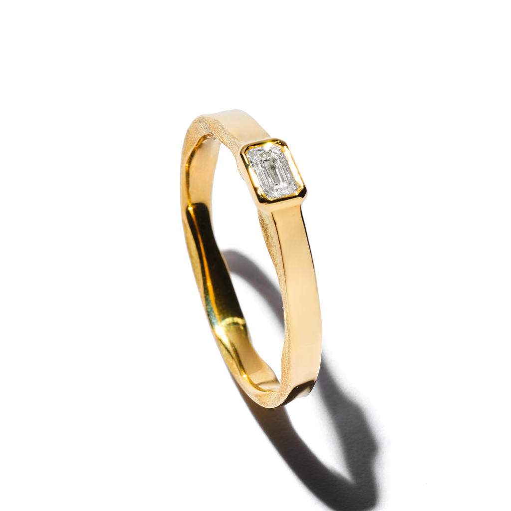 長方形のダイヤモンドをあしらったクラシックなデザイン。18金イエローゴールドの地金部分には、ミラモアのハウスアトリエの職人が手作業で仕上げた繊細なテクスチャーを施しました。金継ぎを思わせるその模様には、ふたりの絆がどんな時も途切れることなく続いていく願いが込められています。時を超えて輝き続ける、特別なリングです。