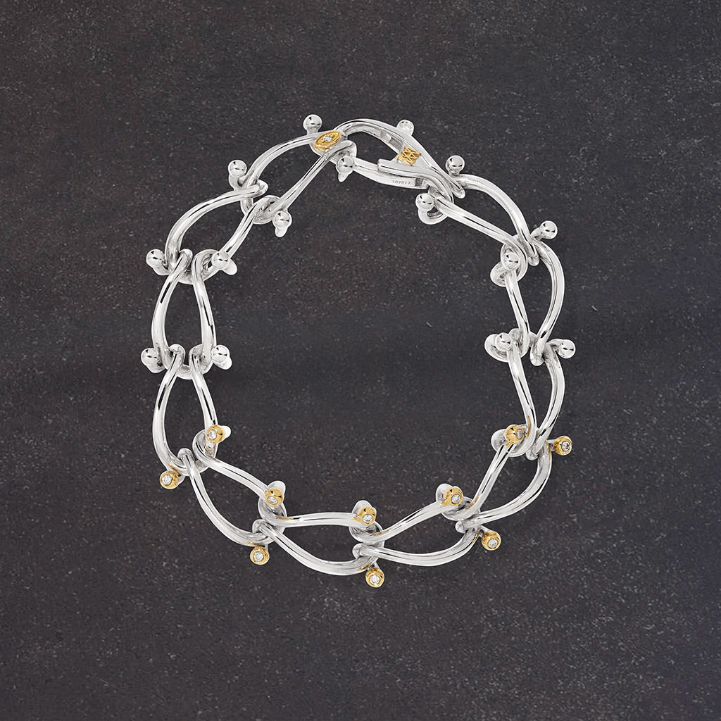 重厚でありながら、滑らかに動くデザイン。知恵の輪から着想を得た、ひとコマずつがパズルのように連なり、自由に組み替えられる構造。18Kイエローゴールドのボールディテールに、そっと光を添える天然ダイヤモンド。シルバーとの静かなコントラストが、手元に奥行きをもたらします。組み替えるたびに、新たな表情を生むチェーン。身に着ける人の感性によって、かたちを変えていく一品です。