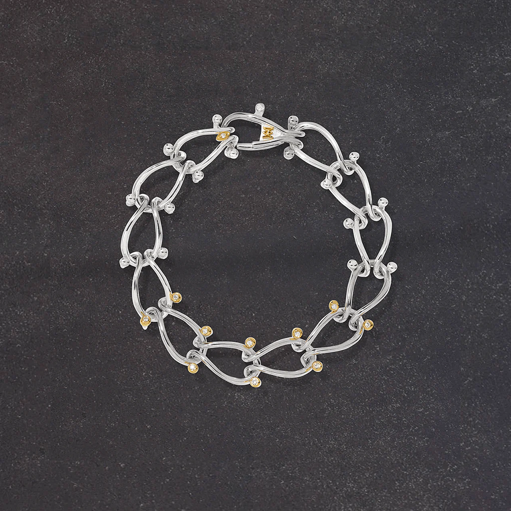 重厚でありながら、滑らかに動く。知恵の輪に着想を得たコマが、噛み合い、連なっていく。クラシックよりひとまわり小さな〈Jr.シリーズ〉は、構築的な存在感を保ちながら、より軽やかに日常に馴染む。シルバーに添えた18Kゴールドのボールと、天然ダイヤモンド。質感の違いが、手元に奥行きあるコントラストを生み出す。つなぎ、ほどき、また姿を変えていく。感性に寄り添う、可変するジュエリー